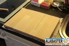 Das Brett sollte auch einen Halter für ein Tablet bekommen, auf dem man sich evtl. Rezepte darstellen lassen konnte. Den fertigte ich aus Plexiglas und einem Stück L-Aluprofil. Das Plexiglas erwärmte ich vorsichtig mit einem Heißluftfön und bog es in einem angenehm zu betrachtenden Winkel nach hinten.