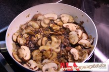Wenn sie etwas Farbe angenommen haben geht es weiter... - Schiebt die Zwiebeln in der Pfanne auf die Seite und gebt auf der der anderen Seite die Champignons dazu.