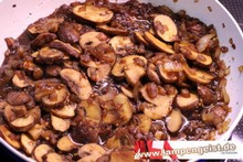 - Jetzt vermengt ihr die Zwiebeln und die Champignons miteinander und löscht mit der Sojasauce ab.