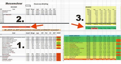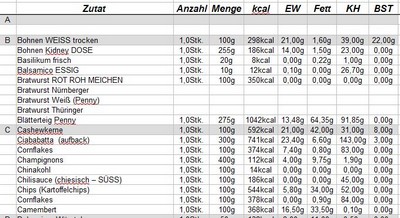 In der Nahrungsmitteltabelle sind die Nährwerte der einzelnen Zutaten hinterlegt.